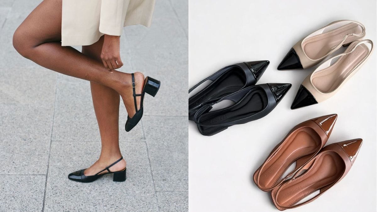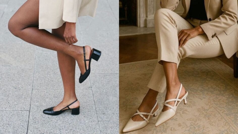 Clássico e versátil, o slingback é um calçado conhecido por apresentar a parte da frente fechada e ser aberto atrás, possuindo uma tira ou presilha ajustável no calcanhar. Popularizado nos anos 50, o sapato combina estabilidade e conforto, sendo ideal para produções formais ou casuais.