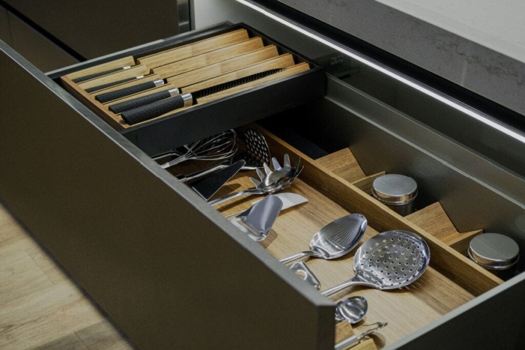 O perfil do morador ou da família em si deve ser um dos primeiros pontos a se considerar no projeto, considerando a rotina, a idade, a cultura e as preferências de quem mora. Se possui crianças, a disposição de gavetas e acessórios deve garantir a máxima segurança. Por exemplo, disponha a gaveta com organizadores de facas com a altura adequada para torná-la inacessível aos pequenos. Analise também a opinião de quem mais vai usar o mobiliário em casa, principalmente ambientes como lavanderia e cozinha.