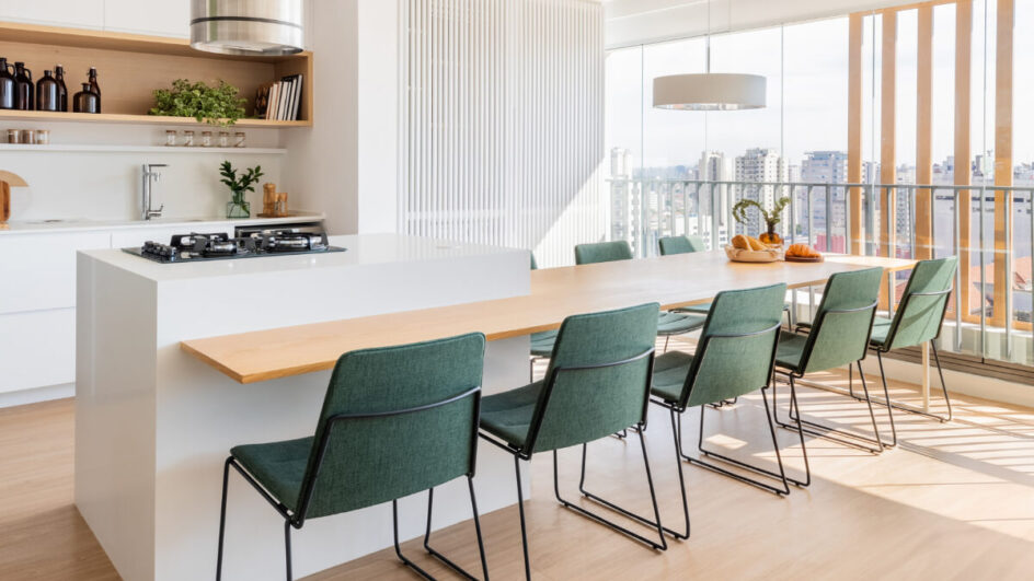 Outra solução que eleva o padrão do projeto são os painéis em marcenaria, com acabamento em bp ou lâmina de madeira natural. Eles criam uma base contínua, aquecem o ambiente e podem integrar portas camufladas para despensas, closets ou áreas de serviço. Essa continuidade visual transmite sensação de amplitude e reforça a sofisticação dos espaços.