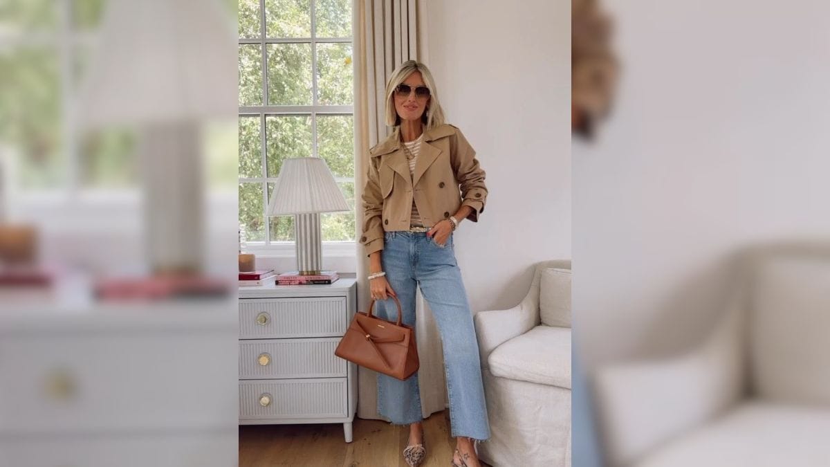 O trench coat cropped, uma versão encurtada e moderna do casaco de trincheira, é uma peça chave para quem busca criar um look moderno. A peça, combinada com o tênis, valoriza a cintura alta da calça mom jeans e cria uma silhueta moderna. A sobreposição das peças traz um dinamismo ao visual e reforça a versatilidade da calça.