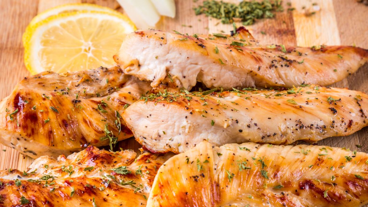 Essa receita de peito de frango assado com limão é simples, mas é preciso que o frango fique marinando por 12 horas na geladeira com os temperos.