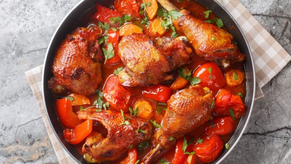 Galinha ensopada no molho de tomate