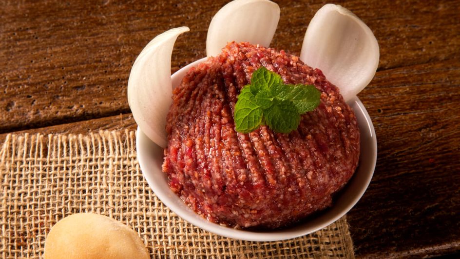 Em uma tigela, coloque a carne moída, o trigo, a pimenta-síria, o sal e misture bem. Em seguida, molde a massa em formato de quibe. Sirva com a cebola, o limão, a hortelã e a cebolinha.