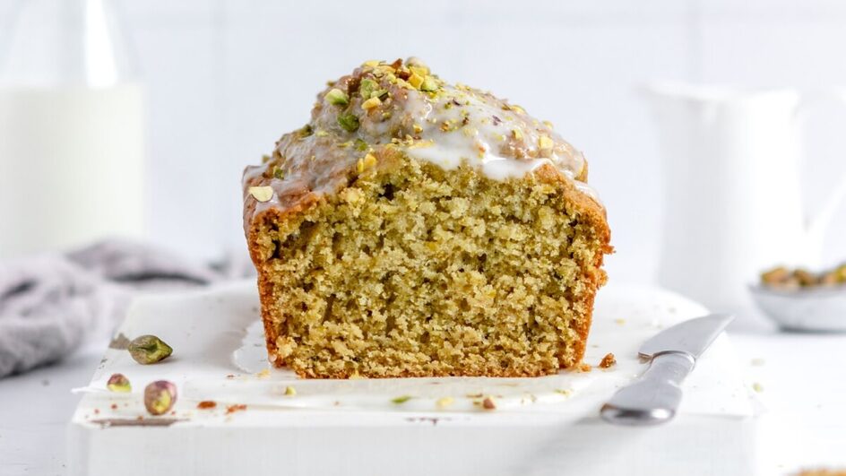 Em uma tigela, misture a farinha de trigo, o pistache moído, o fermento em pó e uma pitada de sal. Reserve. Na batedeira, bata a manteiga com o açúcar até obter um creme. Adicione os ovos e a essência de baunilha, e bata novamente até ficar homogêneo. Gradualmente, incorpore a mistura de pistache à mistura de manteiga, alternando com o leite, até que todos os ingredientes estejam bem incorporados. Despeje a massa em uma forma untada com manteiga e enfarinhada com farinha de trigo. Leve ao forno preaquecido a 180 °C e por 35 minutos. Deixe esfriar e desenforme.