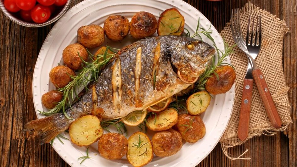 Divida o peixe em duas e, em seguida, faça cortes transversais. Coloque em uma assadeira com a parte cortada para baixo. Tempere com sal, alho e suco de limão. Cubra com papel-alumínio e leve ao forno médio preaquecido por 30 minutos. Em uma panela, cubra a batata com água, acrescente um pouco de sal e leve ao fogo médio para cozinhar até ficar macia. Retire o peixe do forno, coloque as batatas em volta e adicione as cebolas, o cheiro-verde e o pimentão. Leve novamente ao forno até dourar. Sirva em seguida.