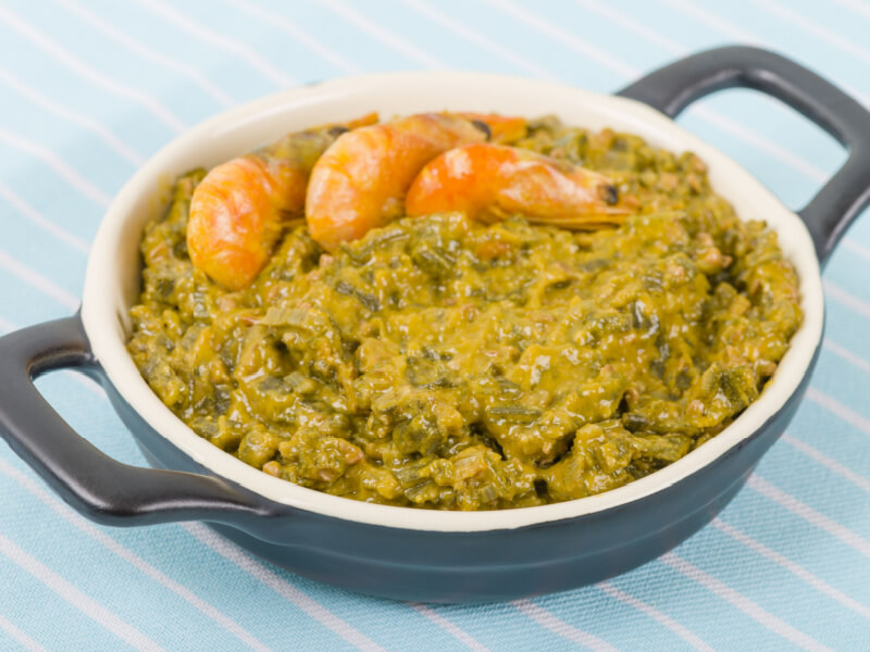 Em uma panela, aqueça o azeite de dendê em fogo médio e refogue a cebola por 5 minutos. Acrescente o quiabo e refogue por mais 15 minutos, mexendo de vez em quando. No liquidificador, bata o camarão seco com o amendoim, a castanha-de-caju e 1/2 xícara de chá de água até formar uma pasta. Depois, transfira essa pasta para a panela com o quiabo, adicione o gengibre, o restante da água e misture bem. Abaixe o fogo, tampe a panela e cozinhe por mais 30 minutos, mexendo sempre. Sirva em seguida.