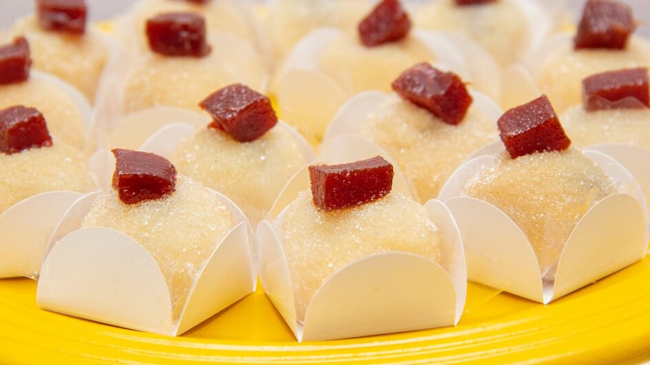 Depois, cubra uma assadeira com plástico filme e disponha a goiabada. Leve ao freezer por 20 minutos. Em seguida, com a ajuda de uma colher, pegue um pouco do brigadeiro reservado, abra, coloque um pedaço de goiabada dentro e modele no formato de uma bolinha. Repita o processo com todo o brigadeiro e finalize decorando com açúcar cristal e pedaços de goiabada. Sirva em seguida.