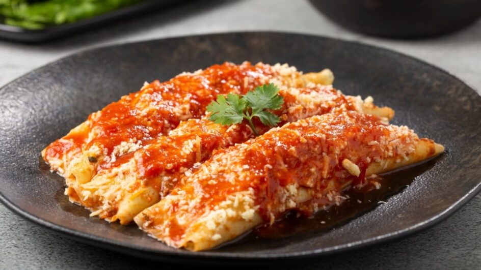 Coloque o recheio de carne moída no centro da panqueca e enrole. Repita esse processo com todos os discos de panqueca. Depois, transfira as panquecas para uma travessa, regue com o molho de tomate e salpique com o queijo ralado. Leve ao forno preaquecido a 200 °C por 5 minutos. Sirva em seguida.