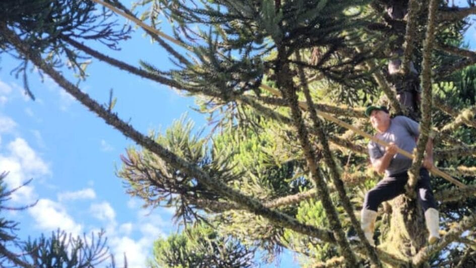 Segundo ele, há dificuldades técnicas para adaptar os equipamentos existentes às características das araucárias, que variam em espessura e possuem galhos que dificultam o uso de cintos e cordas. Ainda assim, Jailson chama atenção: