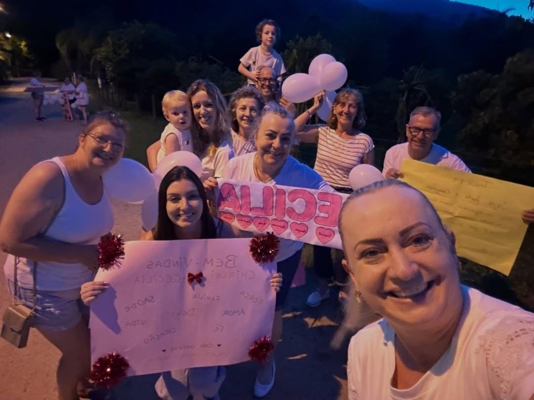 Os corredores do hospital foram tomados por amigos da família em uma despedida marcada por emoção. As lágrimas também caíram na chegada a Pomerode, onde amigos e familiares organizaram uma recepção especial, com cartazes e música preparada exclusivamente para Cecília.