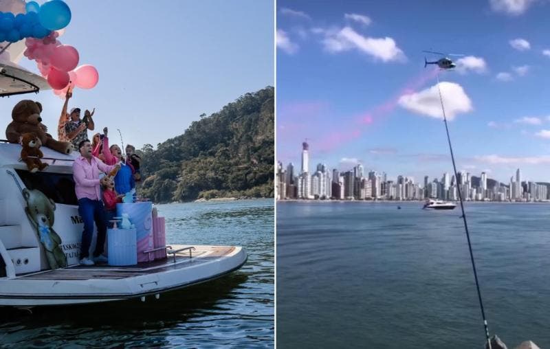 O vídeo viralizou na internet. Nele, um helicóptero sobrevoa uma lancha e lança um pó rosa sobre o mar de Balneário Camboriú, no Litoral Norte de SC, na tarde do último domingo (31/7). É um chá de revelação. Por trás da imagem está a história de amor de uma família que em breve vai aumentar. E, diferente do que muitos internautas comentaram, o evento “de milhões” não custou tanto assim para o casal.