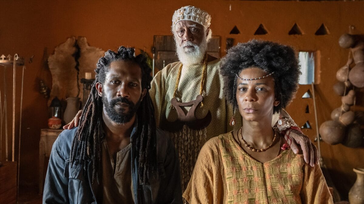 Dumi (Licínio Januário), chefe da guarda de Jendal (Lázaro Ramos), ajuda a princesa Alika (Duda Santos) e a rainha Niara (Erika Januza) a deixarem Batanga rumo ao Brasil. (Foto: Estevam Avellar, Globo)
