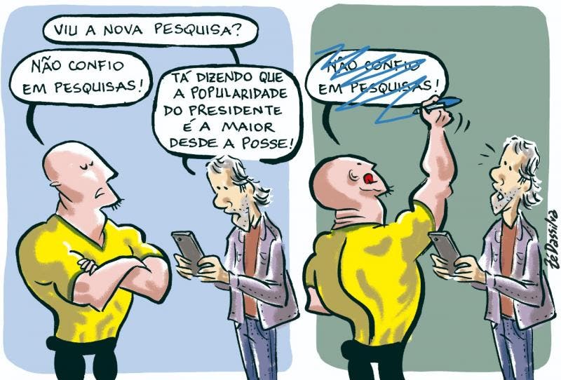 A charge de Zé Dassilva desta sexta-feira (14) trata da nova pesquisa de aprovação do governo de Jair Bolsonaro, que mostra ser a melhor desde o início do mandato. De acordo com o Datafolha, 37% dos brasileiros acham o governo ótimo ou bom, índice maior do que no último levantamento.