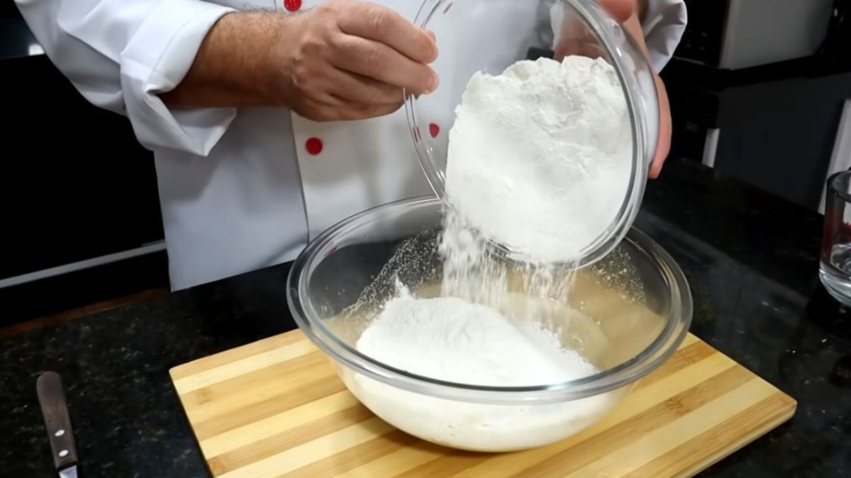 - Após o descanso, molhe as mãos na água para não grudar, pegue a borda da massa e puxe-a para o centro, girando a vasilha. Repita esse processo de dobras por 3 vezes, com intervalos de 20 minutos de descanso entre cada uma. A massa ficará progressivamente mais lisa e elástica;