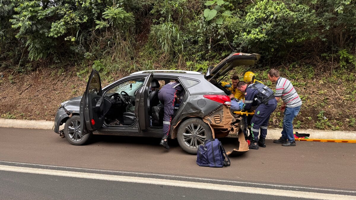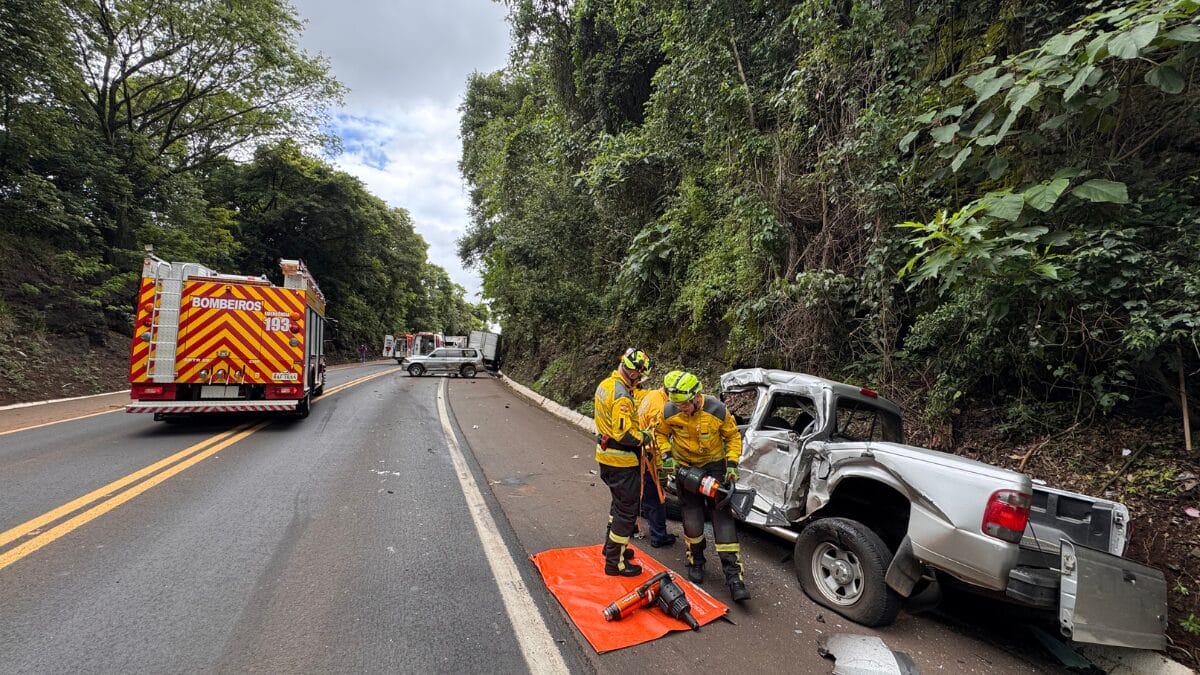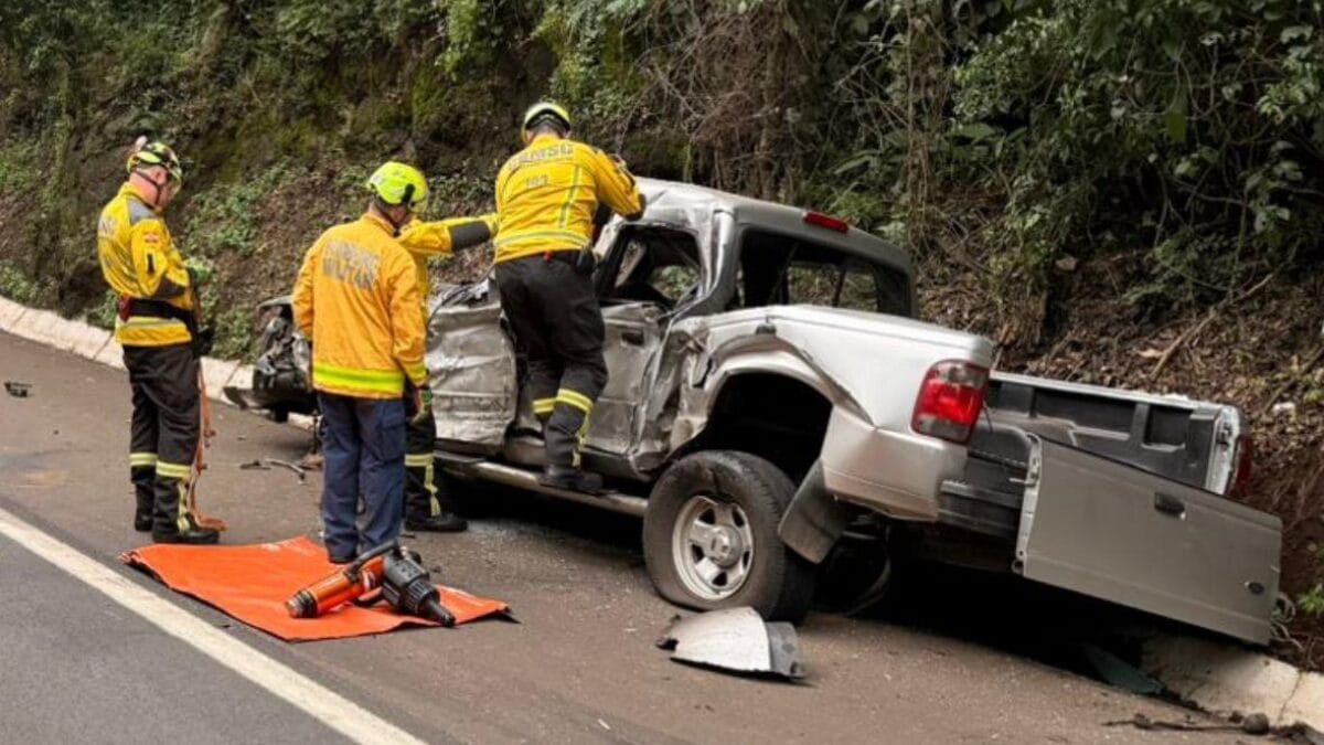 Quando os socorristas chegaram ao local, encontraram um homem já sem os sinais vitais dentro de uma Ford Ranger, com placas de Chapecó. Ele precisou ser desencarcerado pela equipe de resgate.