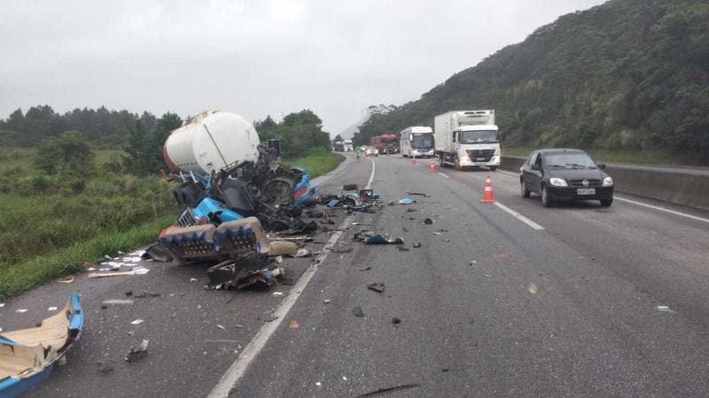 De acordo com a concessionária da rodovia, Arteris Litoral Sul, se tratava de um caminhão limpa fossa com placas de Porto Alegre (RS), que bateu na traseira da carreta. Como ele estava vazio, não houve derramamento na pista.
