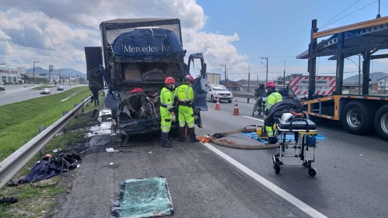 Um engavetamento na BR-101 em Itajaí deixou ao menos duas pessoas gravemente feridas e interditou a rodovia para quem se desloca sentido Sul (Florianópolis) na manhã desta quarta-feira (24). De acordo com a concessionária Arteris Litoral Sul, a batida envolveu uma carreta e um caminhão por volta das 10h30min.