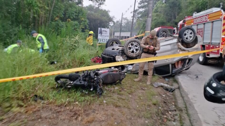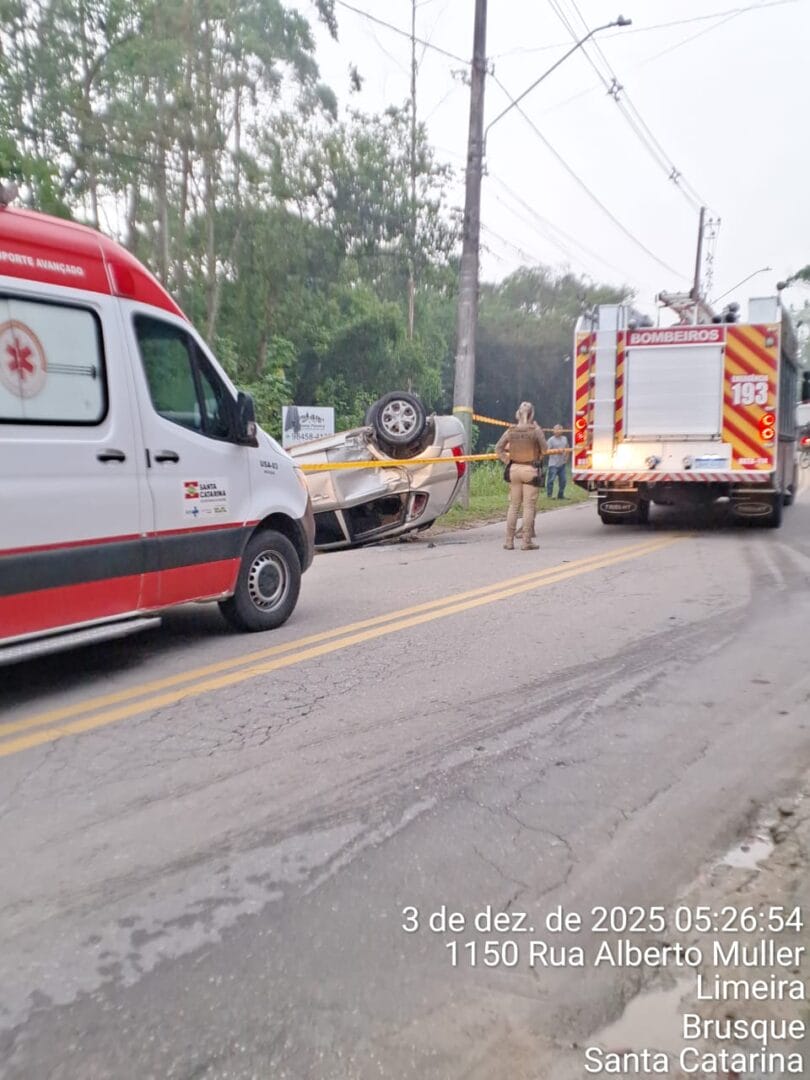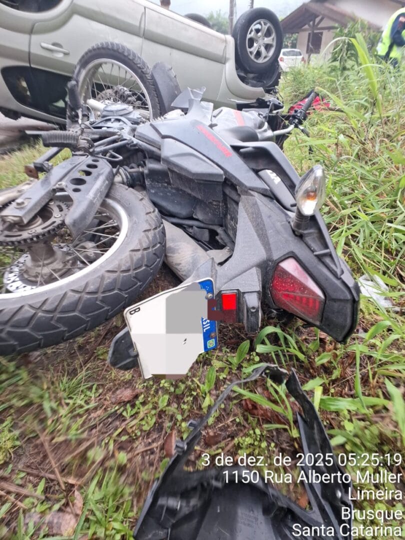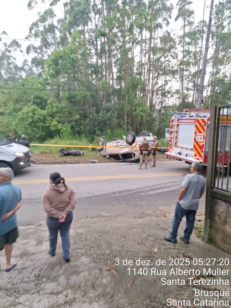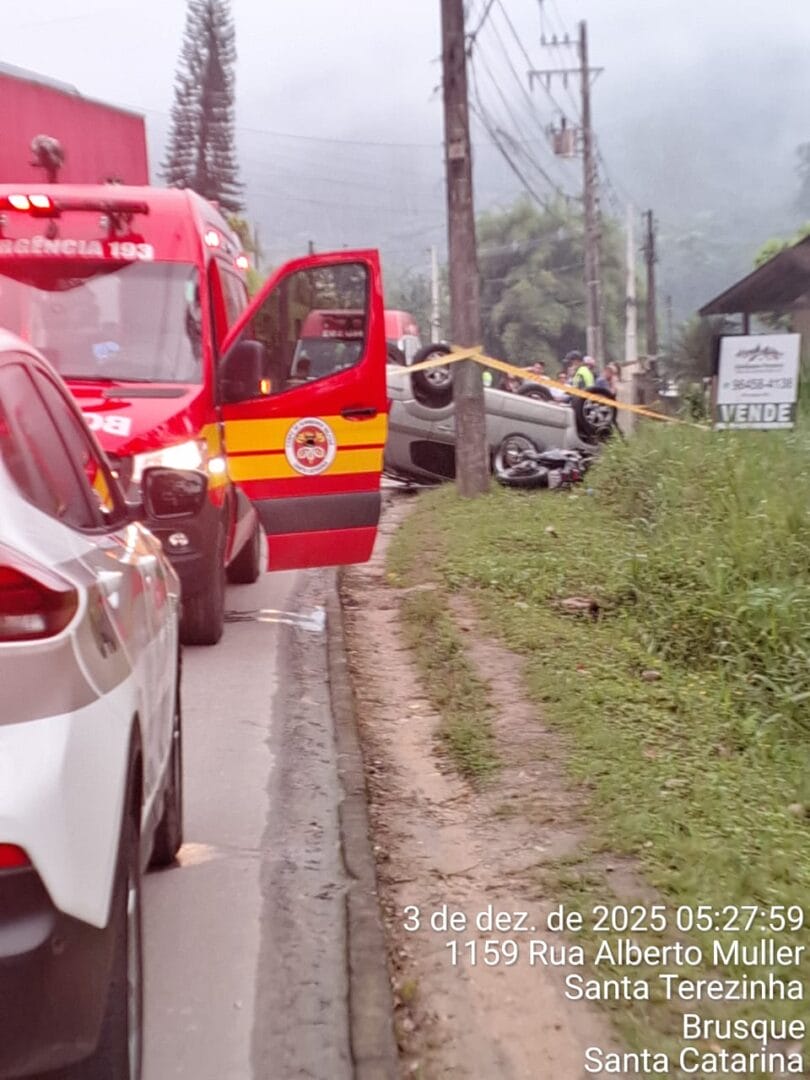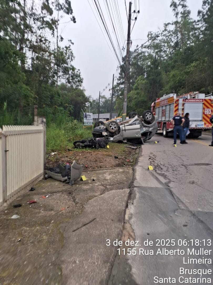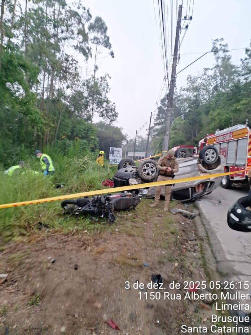 Um motociclista morreu e outras duas pessoas ficaram feridas após um acidente de trânsito na madrugada desta quarta-feira (3) em Brusque. Três viaturas do Corpo de Bombeiros foram acionadas por volta das 4h45min para atender a batida entre os veículos na Rua Alberto Muller, no bairro Limeira.