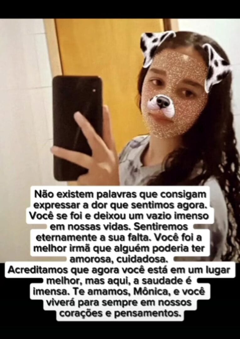 “Não existem palavras que consigam expressar a dor que estamos sentido agora. Sentiremos eternamente a sua falta. Você foi a melhor irmã que alguém poderia ter. Amorosa. Cuidadosa. Você viverá para sempre em nossos corações”, diz post de despedida em homenagem à Mônica.