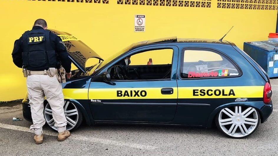 Uma cena inusitada chamou a atenção da Polícia Rodoviária Federal (PRF) na BR-101, em Joinville, na tarde da última quarta-feira (14). Policiais apreenderam um carro adesivado com as palavras “baixo escola”, que fazia alusão aos veículos rebaixados e de autoescola.