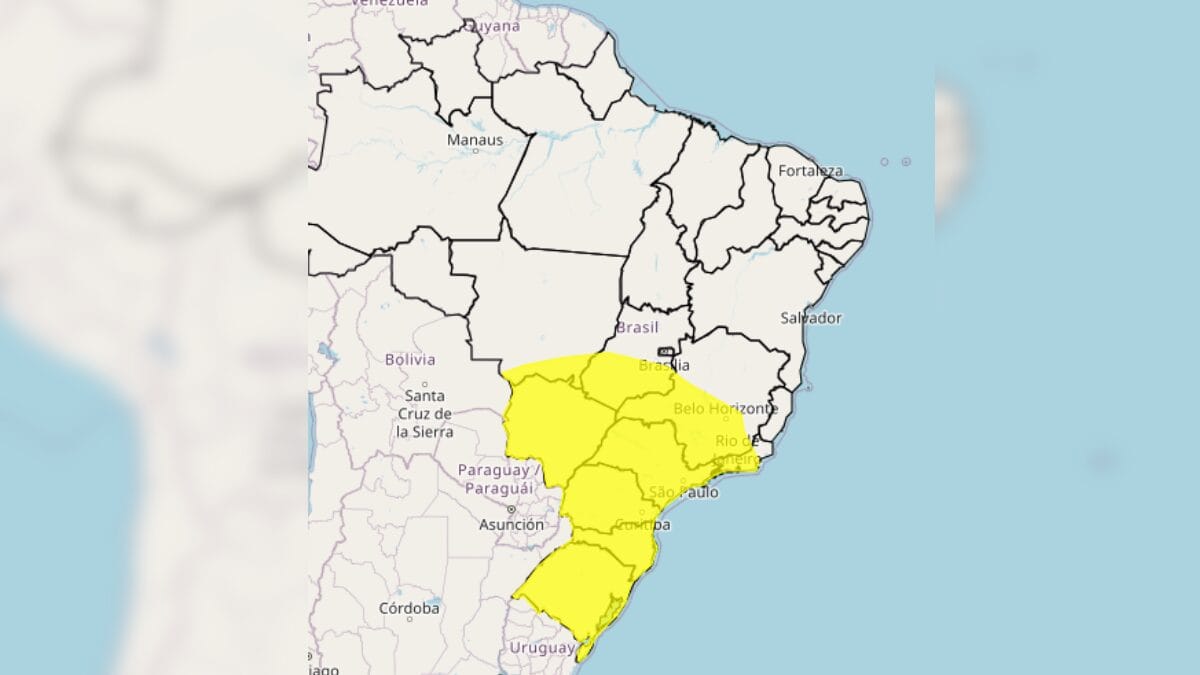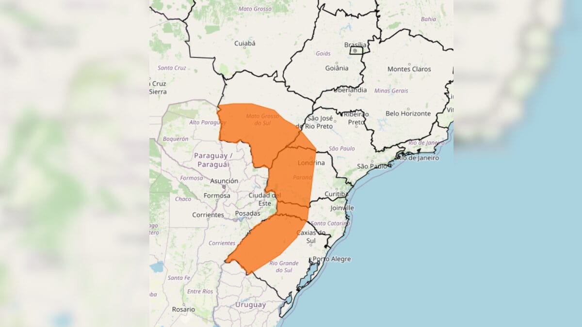 Já os estados de Mato Grosso do Sul, São Paulo, Paraná, Santa Catarina e Rio Grande do Sul entram em alerta para tempestade nesta quinta-feira (19), com chuva entre 30 e 60 mm/h ou 50 e 100 mm/dia, ventos intensos, de 60 a 100 km/h, e queda de granizo. Há risco de corte de energia elétrica, estragos em plantações, queda de árvores e de alagamentos.