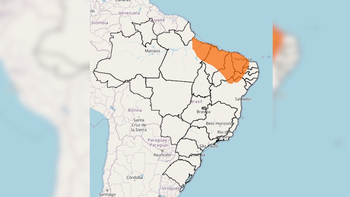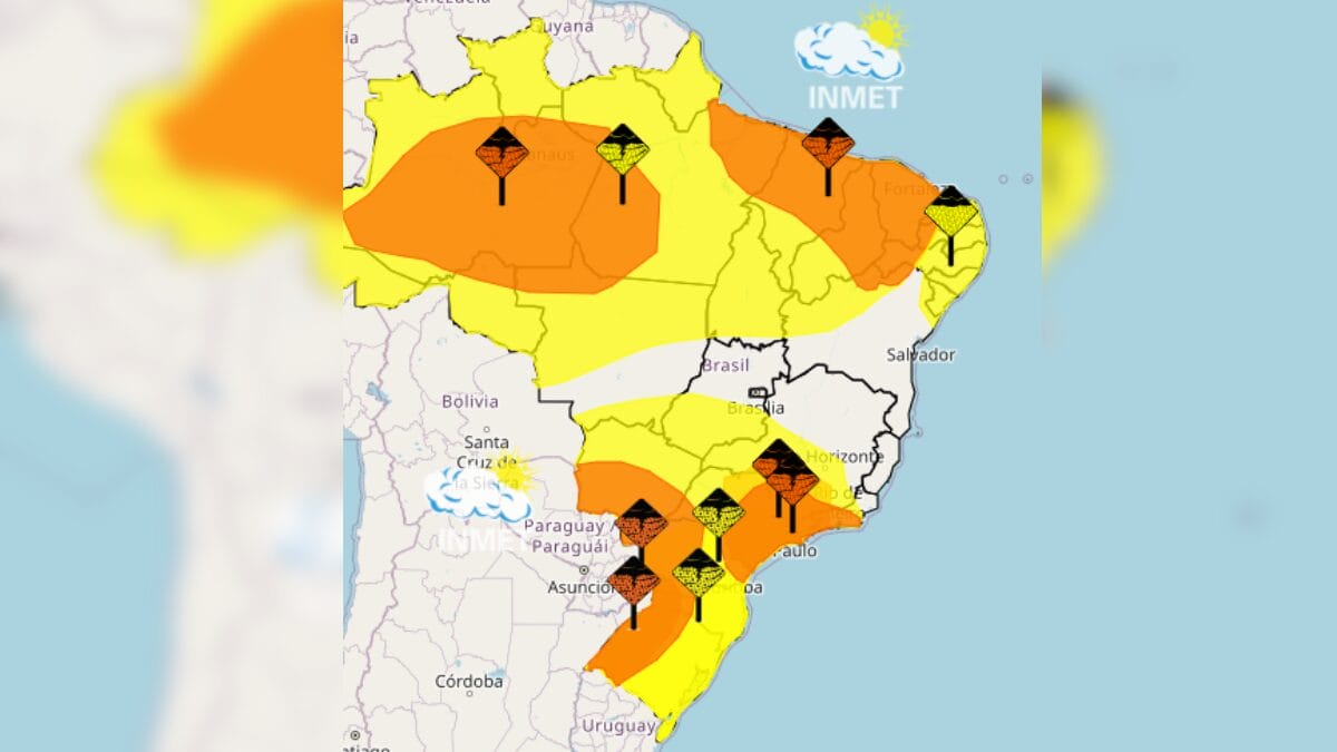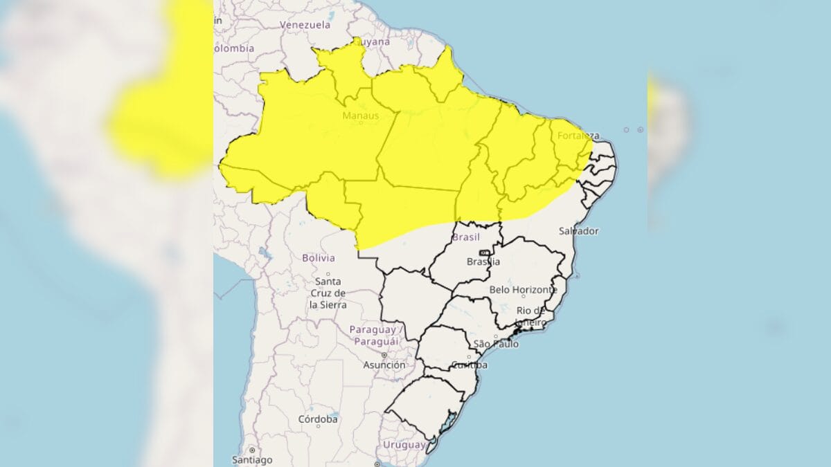 O mapa do Brasil aparece com diversos alertas, em todas as regiões. Nos estados do Norte — Amazonas, Rondônia, Pará e Roraima —, há um alerta laranja de chuvas intensas em vigor até sexta-feira (20), com chuva entre 30 e 60 mm/h ou 50 e 100 mm/dia, com ventos intensos de 60 a 100 km/h. Neste alerta, também está incluído o estado do Mato Grosso. Na mesma situação, estão os estados do Maranhão, Piauí, Ceará, Rio Grande do Norte, Paraíba, Pernambuco e Bahia, assim como Minas Gerais e Rio de Janeiro