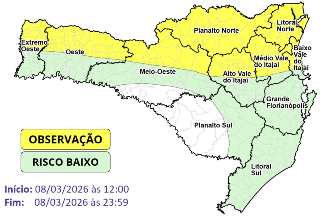 A Defesa Civil de Santa Catarina publicou, neste domingo (8), um alerta de risco moderado para temporais na metade Norte do Estado, a partir da tarde. A instabilidade é resultado da passagem de um sistema frontal e a atuação de um sistema de baixa pressão sobre o mar, conforme o órgão estadual.