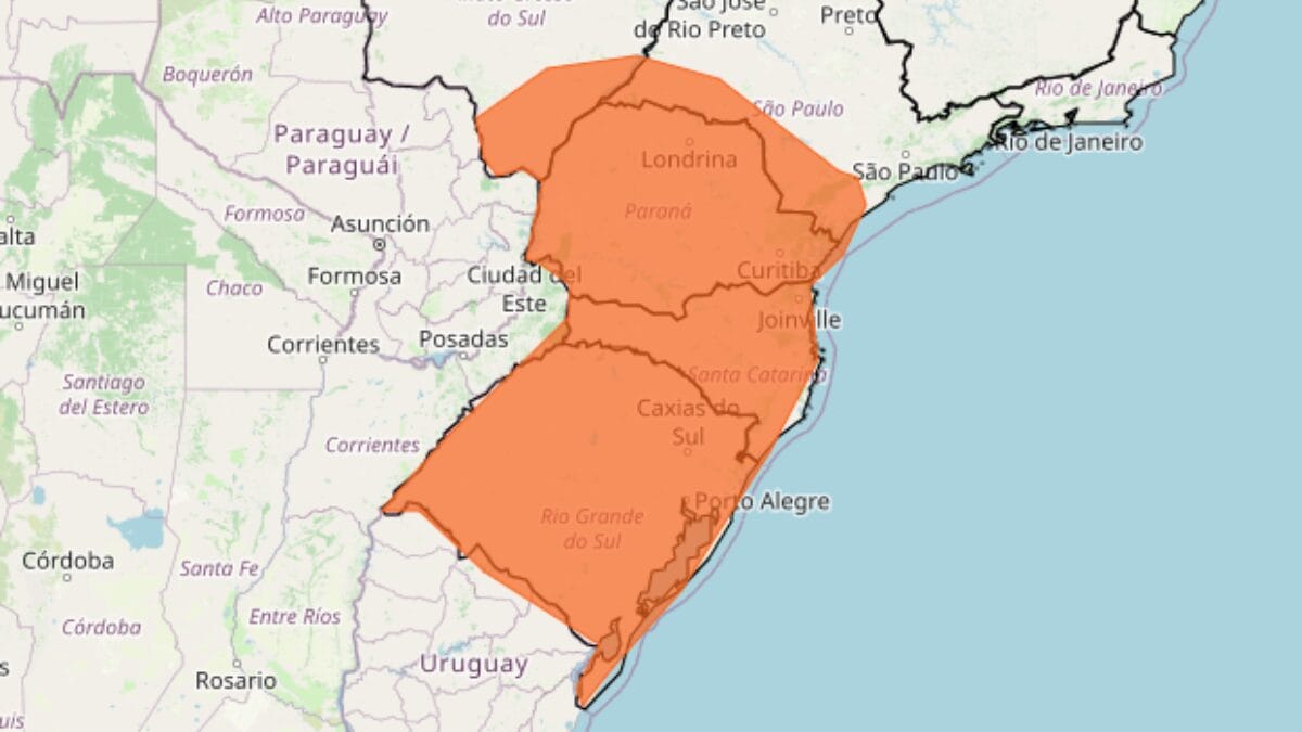 O Instituto Nacional de Meteorologia (Inmet) publicou nesta terça-feira (17) alerta laranja, de “perigo”, para tempestades em Santa Catarina e mais quatro estados do Brasil: Paraná Rio Grande do Sul, Mato Grosso do Sul e São Paulo. O aviso vale até a manhã de quarta-feira (18).