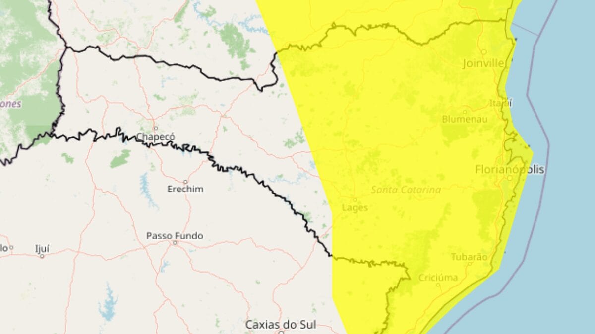 Apesar de não estar entre os estados em alerta para chuvas de até 100 milímetros, Santa Catarina foi colocado em alerta amarelo para “perigo potencial”, com chance de volumes entre 20 e 30 milímetros por hora ou até 50 milímetros por dia, com ventos intensos de 40 a 60 km/h.