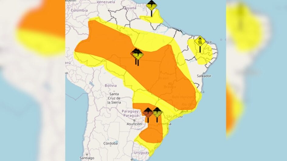 Segundo o Inmet, há chance de chuvas intensas que podem chegar a 100 milímetros por dia e rajadas de ventos de até 100 km/h. O órgão alerta para risco de corte de energia elétrica, queda de galhos de árvores, alagamentos e descargas elétricas.