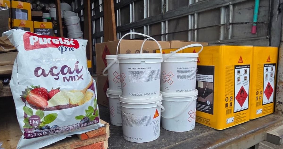 No compartimento de carga, os agentes encontraram pó de bebida láctea armazenado ao lado de materiais como impermeabilizantes, líquidos inflamáveis e substâncias corrosivas, situação considerada irregular pelas normas sanitárias e ambientais.