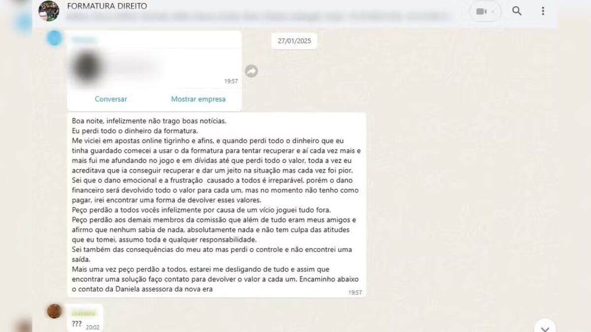A presidente da comissão de formatura mandou uma mensagem para o grupo de colegas no dia 27 de janeiro, pouco menos de um mês antes de quando a festa aconteceria. Na mensagem, ela diz que usou todo o dinheiro em apostas on-line: