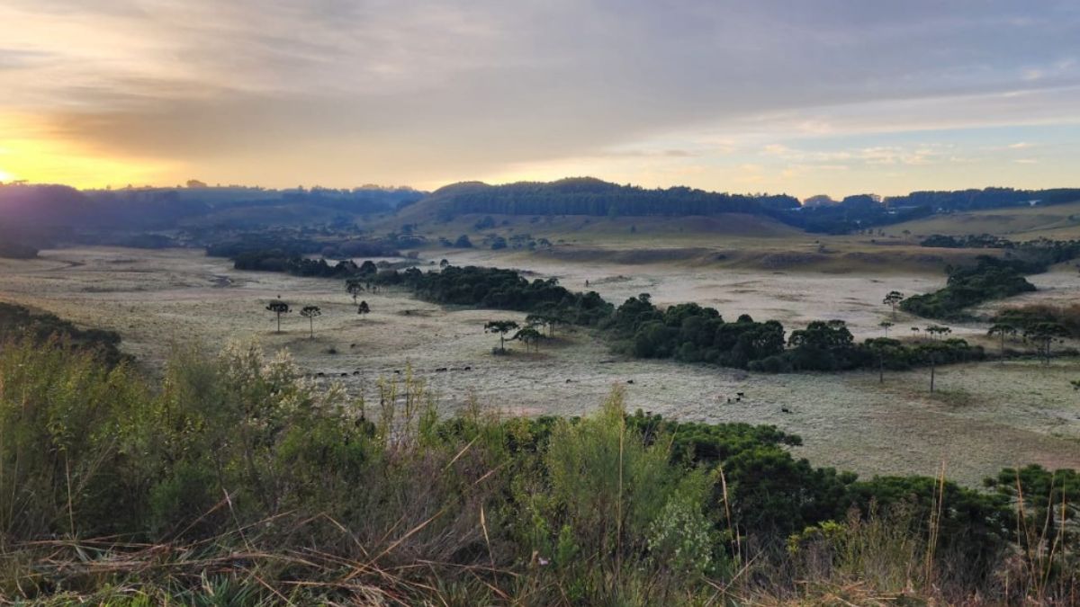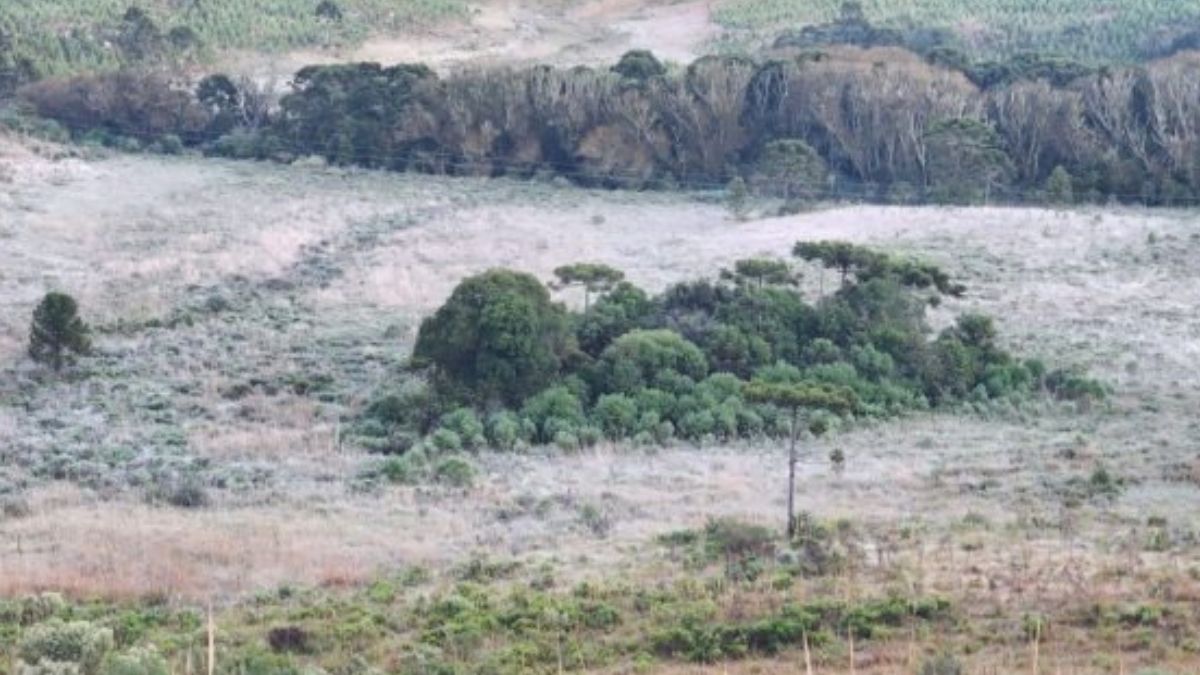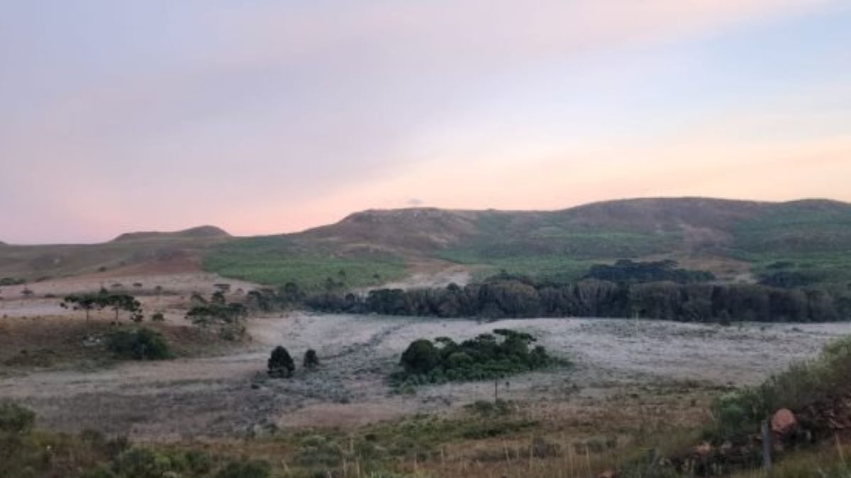 As imagens das primeiras horas do dia, registradas pelo fotógrafo e Jornalista Wagner Urbano, mostraram campos branquinhos, cercas congeladas e uma camada de gelo sobre a vegetação.
