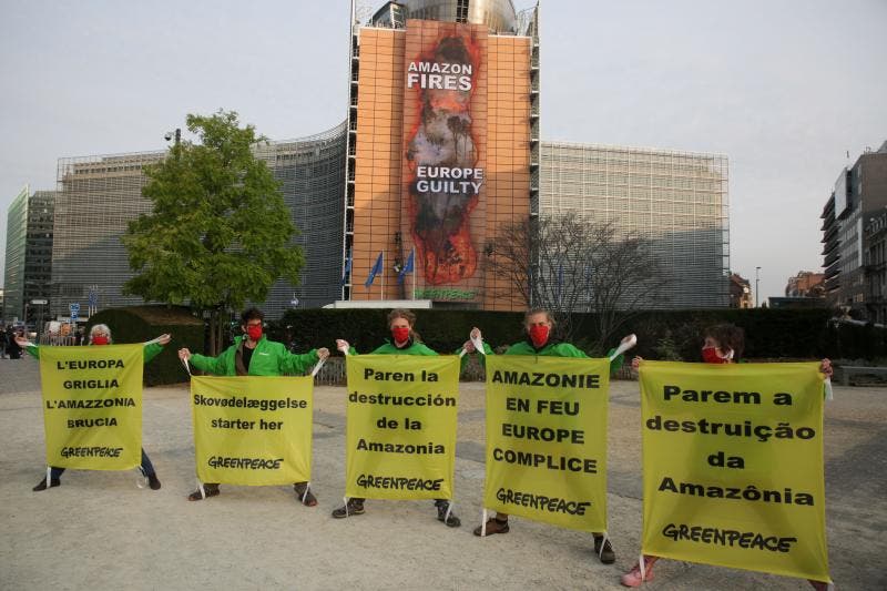 A ONG Greenpeace estendeu, nesta sexta-feira (11), uma faixa gigante na fachada da sede da Comissão Europeia, em Bruxelas, para denunciar o desmatamento da floresta amazônica, especialmente no Brasil, com uma mensagem categórica: “Amazônia queima, Europa é culpada”.