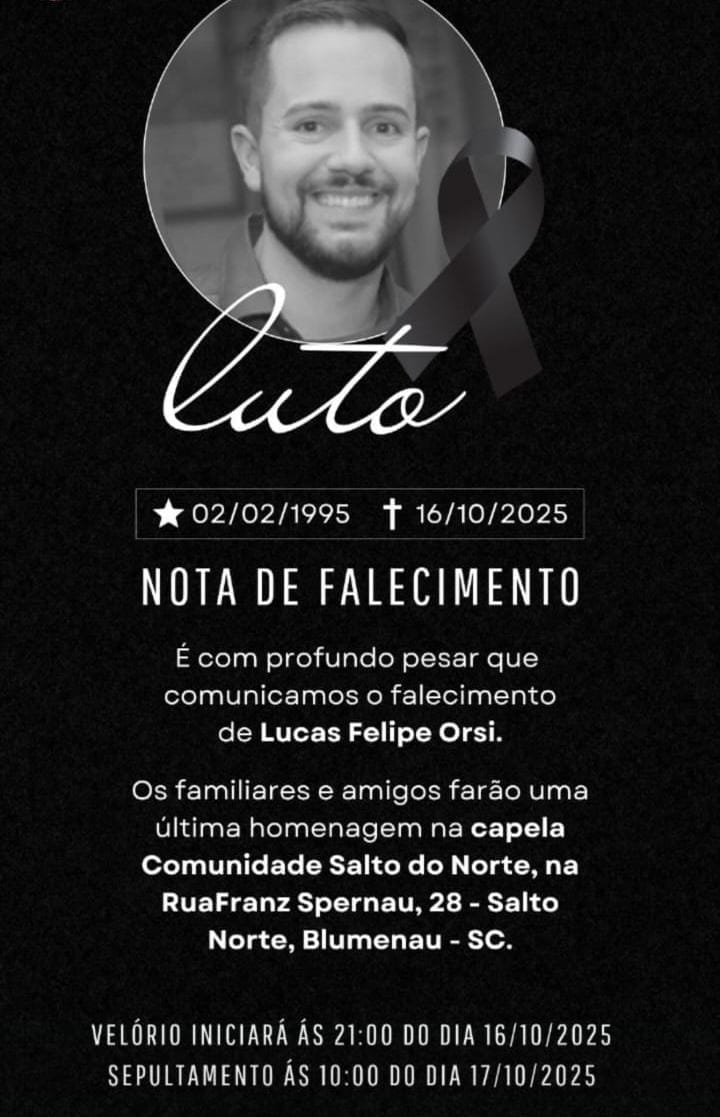 Amigos e familiares dão o último adeus a Lucas Felipe Orsi na capela da comunidade Salto do Norte, em Blumenau, nesta manhã de sexta-feira (17). O homem de 30 anos morreu no violento acidente na BR-470, em Indaial, na manhã de quinta (16). Outras duas pessoas ficaram feridas na colisão que envolveu o carro dele, uma carreta e outro automóvel.