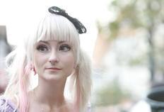 Ela usa cílios postiços e lentes de contato que aumentam os olhos e dão uma cor azulada ao olho naturalmente castanho. O cabelo platinado tem algumas mechas rosas e a pele é branca como a de uma boneca de porcelana.
