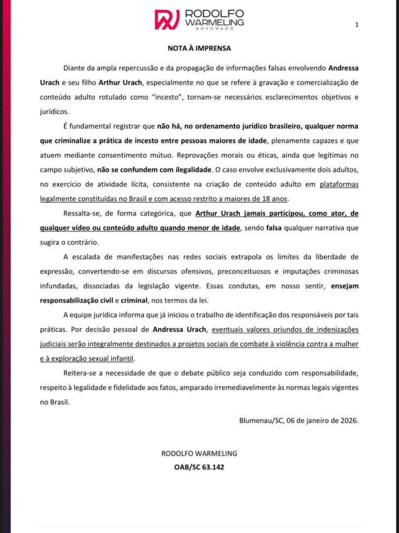 A nota publicada em conjunto entre advogado e cliente frisa que não há na legislação brasileira a previsão de incesto quando se trata de dois adultos conscientes de seus atos. Cita ainda que o filho, atualmente com 20 anos, não participou de nenhuma gravação de conteúdo adulto enquanto era menor de idade, ao rebater informações falsas propagadas na internet, diz Warmeling.