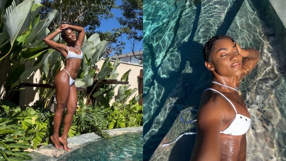 Erika Januza aproveitando a piscina da sua casa que tem formato bem diferente. (Foto: Reprodução, Redes Sociais)