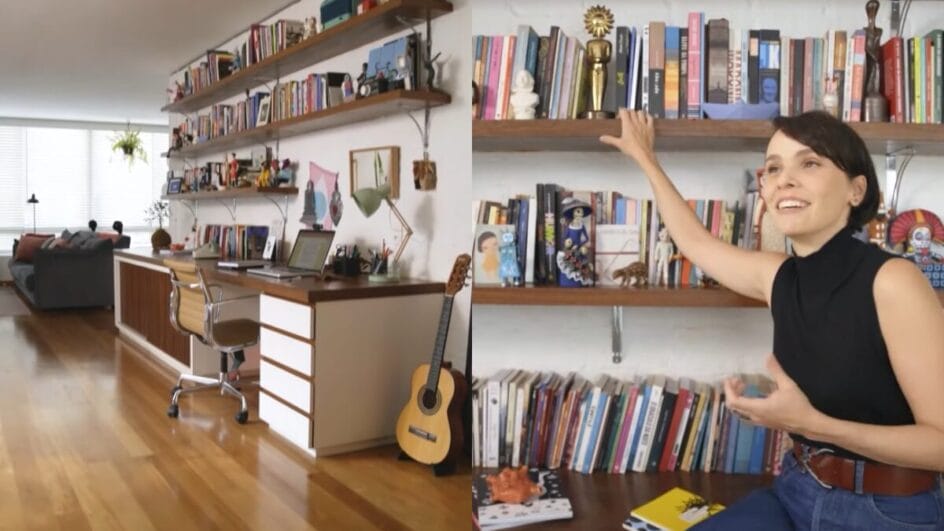 Atriz conta que a área da estante também funciona como escritório onde ela estuda novos projetos. (Foto: Reprodução, YouTube, Casa GNT)
