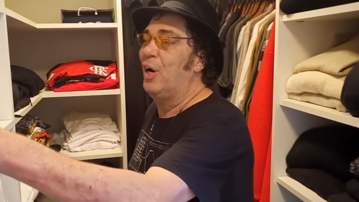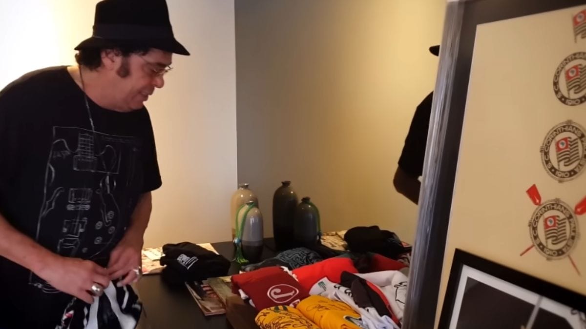 O tour termina no closet. Lá ficam duas outras marcas registradas do Casagrande: a coleção de tênis All Star, e as camisetas de ídolos do rock e de bandeiras que levanta.