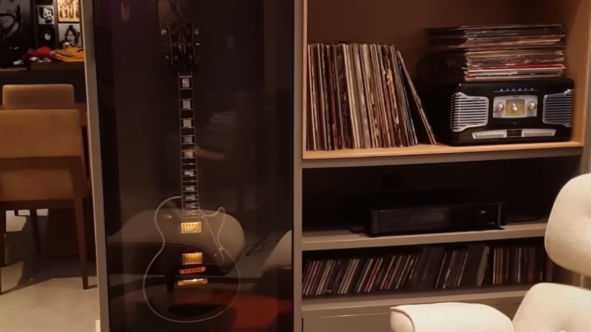 O duplex ainda reserva um canto especial para uma vasta coleção de discos de vinil e uma guitarra Gibson Les Paul preta, exposta em uma estante de vidro.