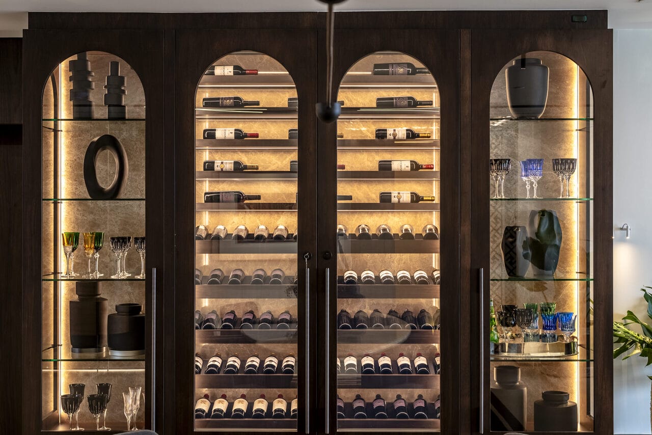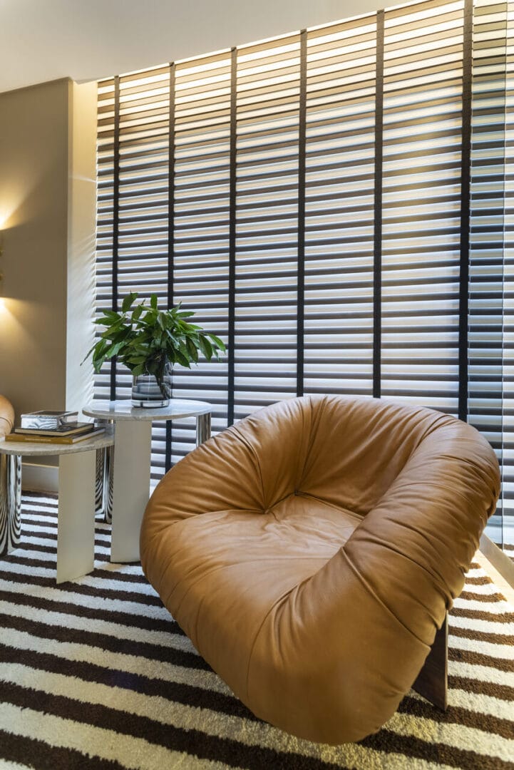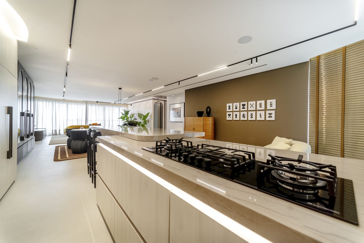 Entre as peças-chave da decoração do imóvel estão poltronas, puff e almofadas que criam uma paleta sofisticada com tons de bege, cinza e marrom, que complementam a iluminação natural e valorizam os outros elementos de design. A curadoria de móveis e elementos decorativos incluiu, ainda, um sofá Sandia e cadeiras Totu. Uma adega climatizada para mais de 100 garrafas também compõe o imóvel.
