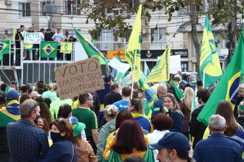 Apoiadores do presidente Jair Bolsonaro (sem partido) em Santa Catarina se manifestam neste domingo (1º) em defesa do voto impresso. O ato acontece em grandes cidades catarinenses como Florianópolis, Joinville, Blumenau, Itajaí, Balneário Camboriú, Chapecó, Criciúma e Tubarão. Nem todos os participantes respeitaram o decreto estadual que determina o uso de máscara por conta da pandemia do coronavírus.