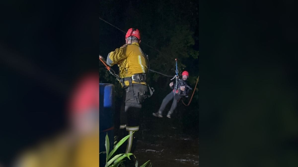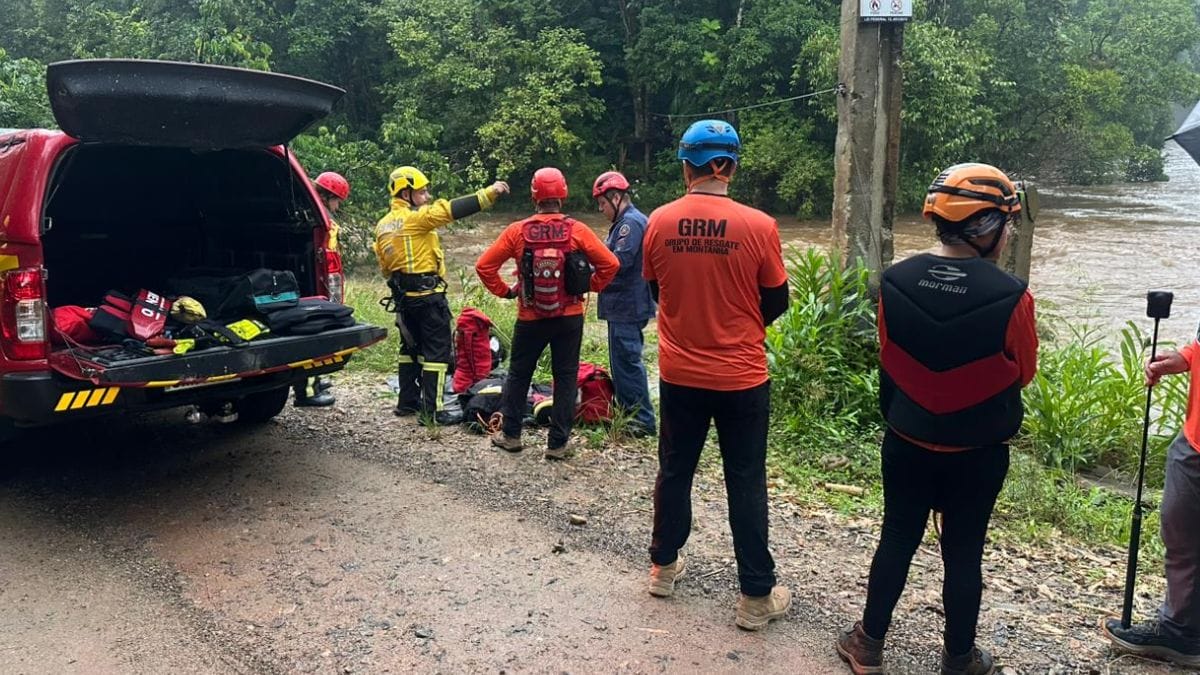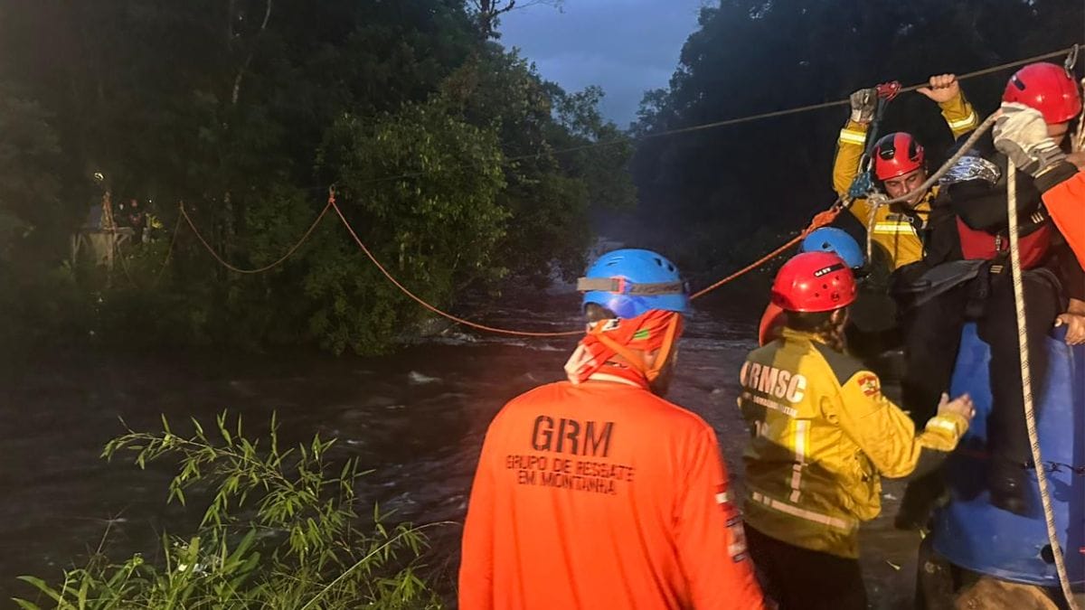 Dezesseis pessoas e um cachorro precisaram ser resgatados após uma forte chuva atingir a região do Monte Crista, em Garuva, durante o domingo (5). Trilheiros não conseguiram voltar para o local de onde tinham saído por conta do nível do rio, que subiu com a chuva, e impediu a travessia.