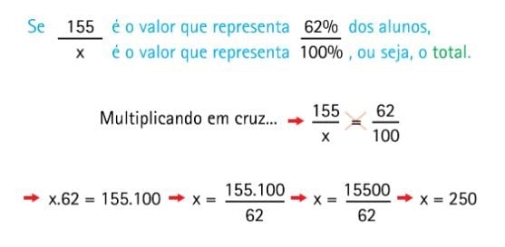 Se 38% são as alunas, então os alunos são os outros 62% (100% – 38%). Assim sendo, podemos montar o esquema novamente com a regra de três simples diretamente proporcional: