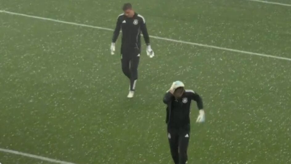 Veja a chuva de granizo no aquecimento de Alemanha x Portugal