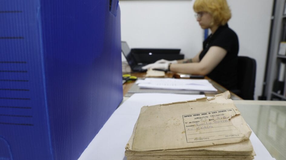 — O acervo de negativos fotográficos do Jornal de Santa Catarina constitui um conjunto documental de elevado valor histórico, informacional e probatório, reunindo aproximadamente 55 anos de registros visuais que documentam acontecimentos de relevância social, política, econômica e cultural. É uma fonte primária essencial para a compreensão da história regional e da produção jornalística ao longo de diferentes períodos — destaca Mirela.