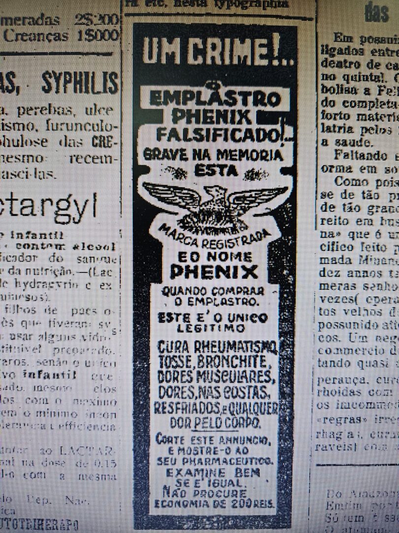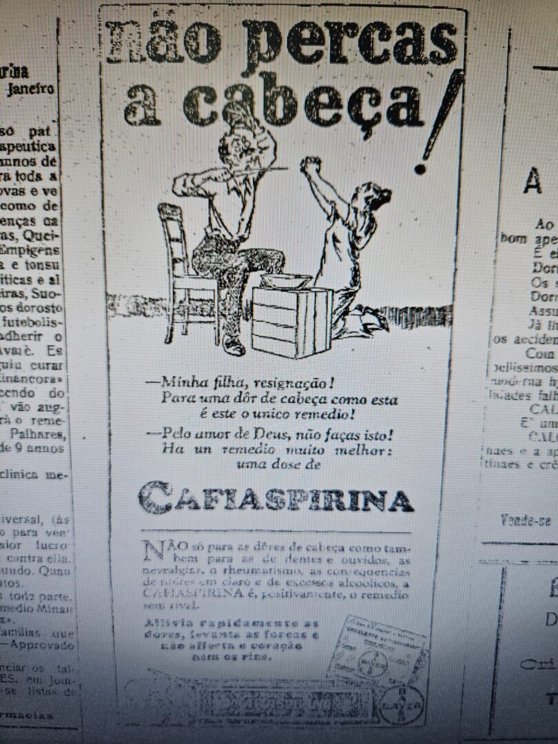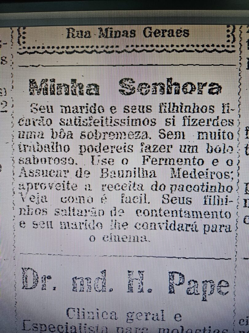 “Mães quereis que vossos filhos tenham uma dentadura forte e alva?”, questiona outro anúncio. Em uma propaganda de fermento, o texto diz que os “filhinhos” vão saltar de “contentamento” se a receita for feita usando a marca. Carregados de apelo e pensamentos comuns para a década, as imagens lotaram as páginas dos jornais.