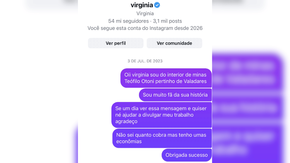 “Oii virginia sou do interior de minas Teófilo Otoni pertinho de Valadares. Sou muito fã da sua história”, escreveu a participante na época. Na sequência de mensagens, Milena demonstra disposição em investir financeiramente na divulgação, mencionando que possuía recursos guardados para esse fim.