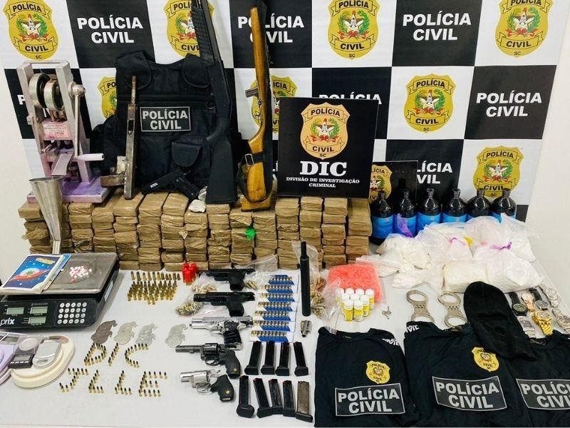 Além disso, segundo a polícia, foram apreendidas camisetas com emblemas da Polícia Civil de Santa Catarina e coletes balísticos. No bairro Morro do Meio, também foi localizado um laboratório utilizado para produção e armazenamento de entorpecentes, onde foram apreendidos cocaína, maconha, ecstasy e cinco prensas hidráulicas.